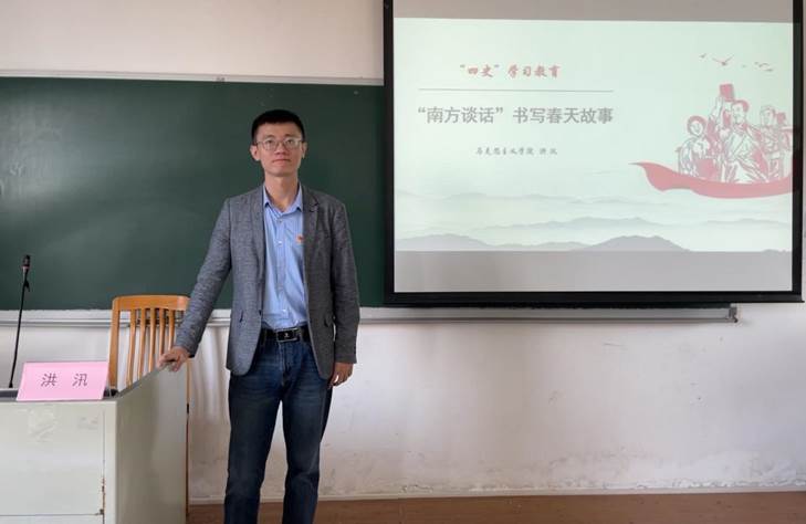 法学院党委书记杨敏生分享自己学习“南方谈话”的感悟。他寄语同学们要将自己个人的成长与党和国家的发展需要紧密结合起来,努力成为具有坚定理想信念、强烈家国情怀、扎实法学根底的法治人才。