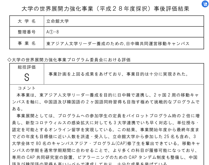 本网讯 3月2日,日本文部省下属学术振兴委员会(JSPS)公布了针对2016年至2021年5年间日本开展的25个同亚洲各国进行的大学交流项目的评价结果,我校所在GRD亚洲校园团队获得S级评价,即最高评价。