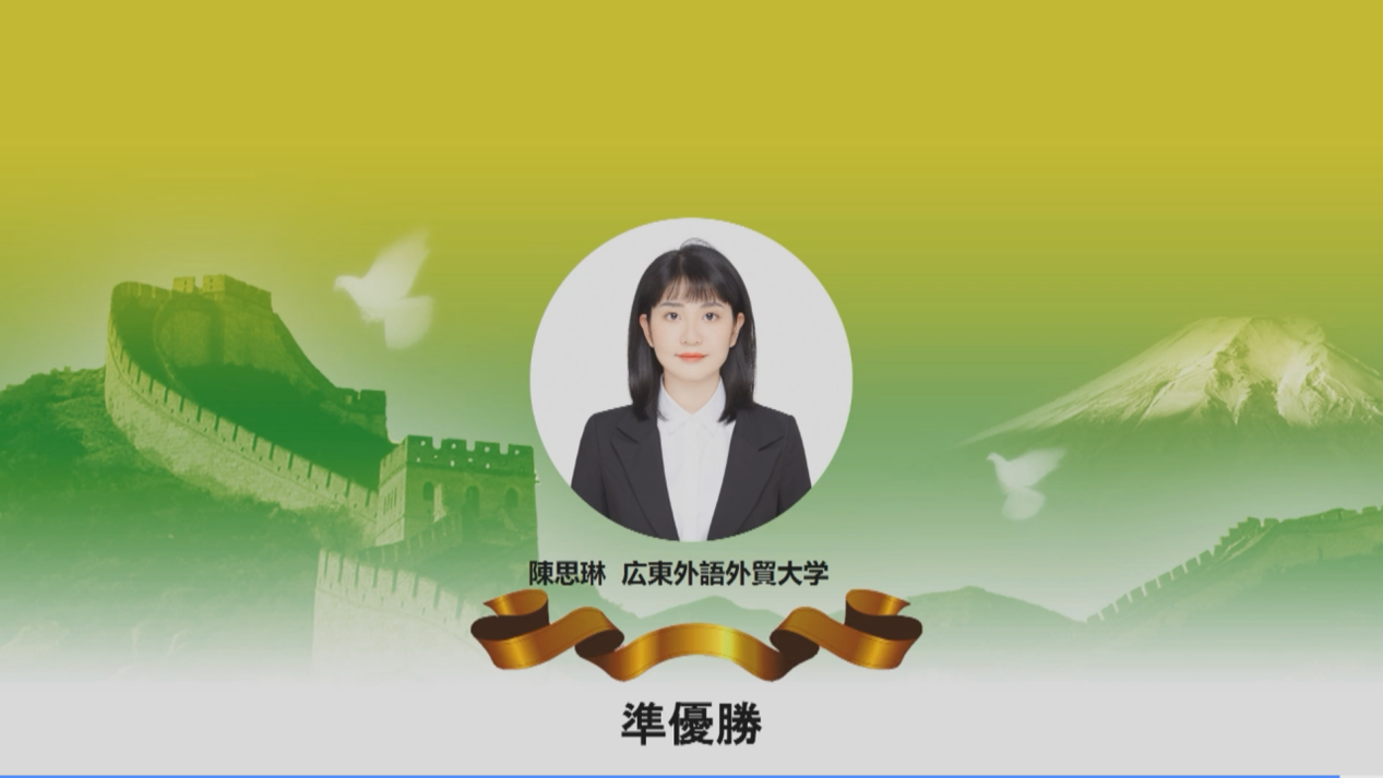 本网讯 近日,由中国教育国际交流协会、日本经济新闻社、中日学术交流中心联合主办的第十六届中华全国日语演讲比赛全国总决赛以在线直播方式举行。我校日语学院、亚非学院(筹)本科2018级学子陈思琳以优秀的表现荣获总决赛亚军,学院杨晔、全明、细井骏吾荣获优秀指导教师奖。