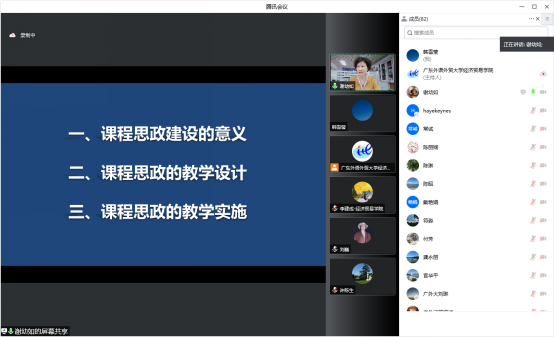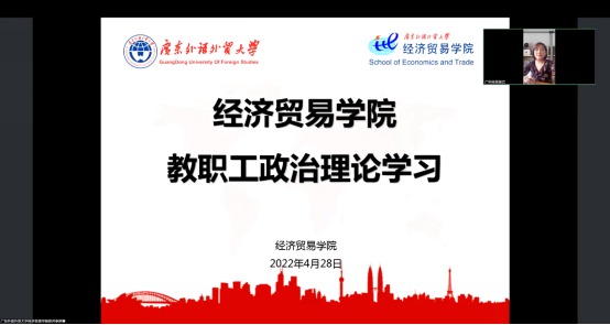 本网讯 4月28日,为深入学习贯彻习近平总书记在中国人民大学考察时重要讲话精神,进一步把重要讲话精神转化为实际育人行动和扎扎实实的工作实效,经济贸易学院开展线上教职工政治理论学习会议,邀请华南师范大学教授谢幼如开展课程思政教学专题讲座,会议由院党委书记梁洁主持,全院教职工参加活动。