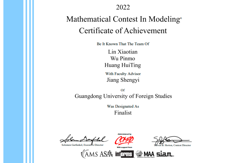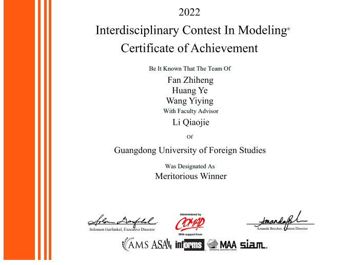 我校历来重视数学建模竞赛(包括美国大学生数学建模竞赛、全国大学生数学建模竞赛、广州市数学建模联赛、广外数学建模挑战赛等),每年由数统学院负责组织,教务处、网信中心、校团委等部门提供支持。数统学院在校内开展了广泛宣传动员,依托数学建模与大数据实验室对参赛学生开展集训,从基础知识拓展、数学建模与求解、美赛流程与实战演练、英文论文写作等方面对参赛学生进行了系统训练,使学生的参赛能力获得了显著提高,助力我校学生在本次美国大学生数学建模竞赛中取得优异成绩。