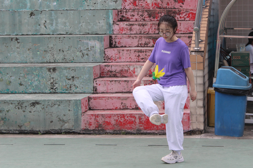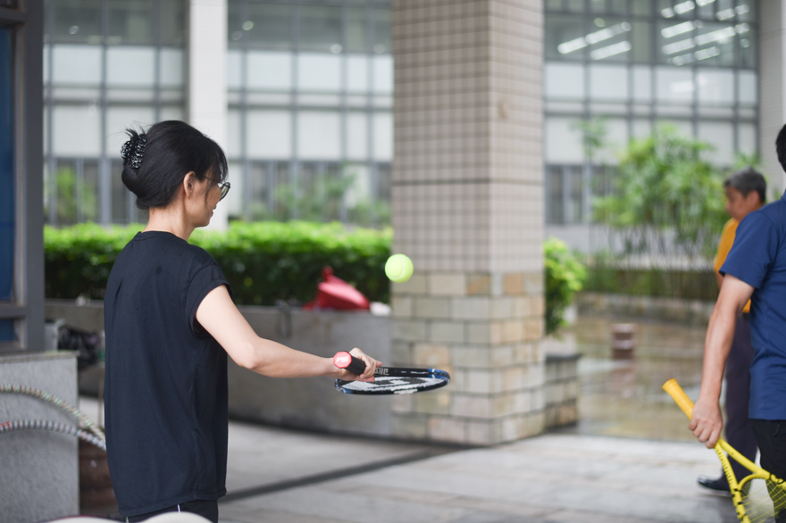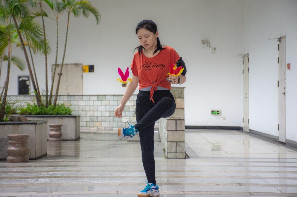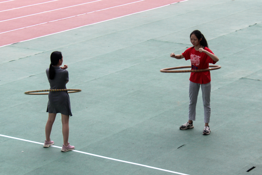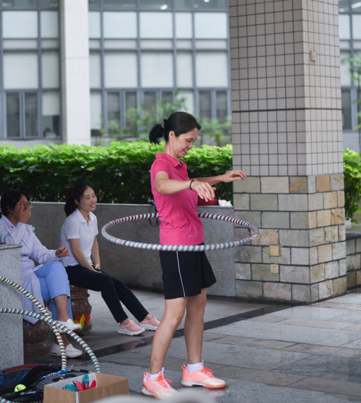 今年的比赛项目是踢毽子,教职工们积极参与,随着裁判员一声令下,无数只彩色的毽子上下翻飞,伴随着欢声笑语阵阵喝彩声,各色的毽子在四个人脚上传递和跳跃,组成一张自然欢快的运动图景。展现了教职工们超越自我的精神面貌。在踢毽子比赛间隙,教师们拿起球拍给大家带来了一场精彩的颠球表演赛。随着网球的起落,教职工们翻转球拍。除此之外,还有转呼啦圈比赛,蓬勃的运动热情展现出广外教职工们活力和对生活的热爱。