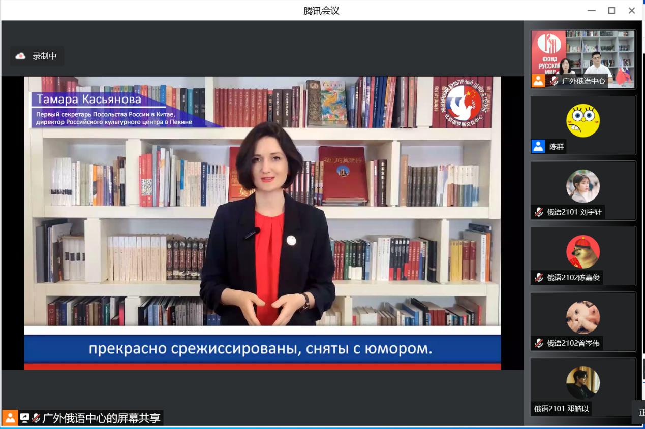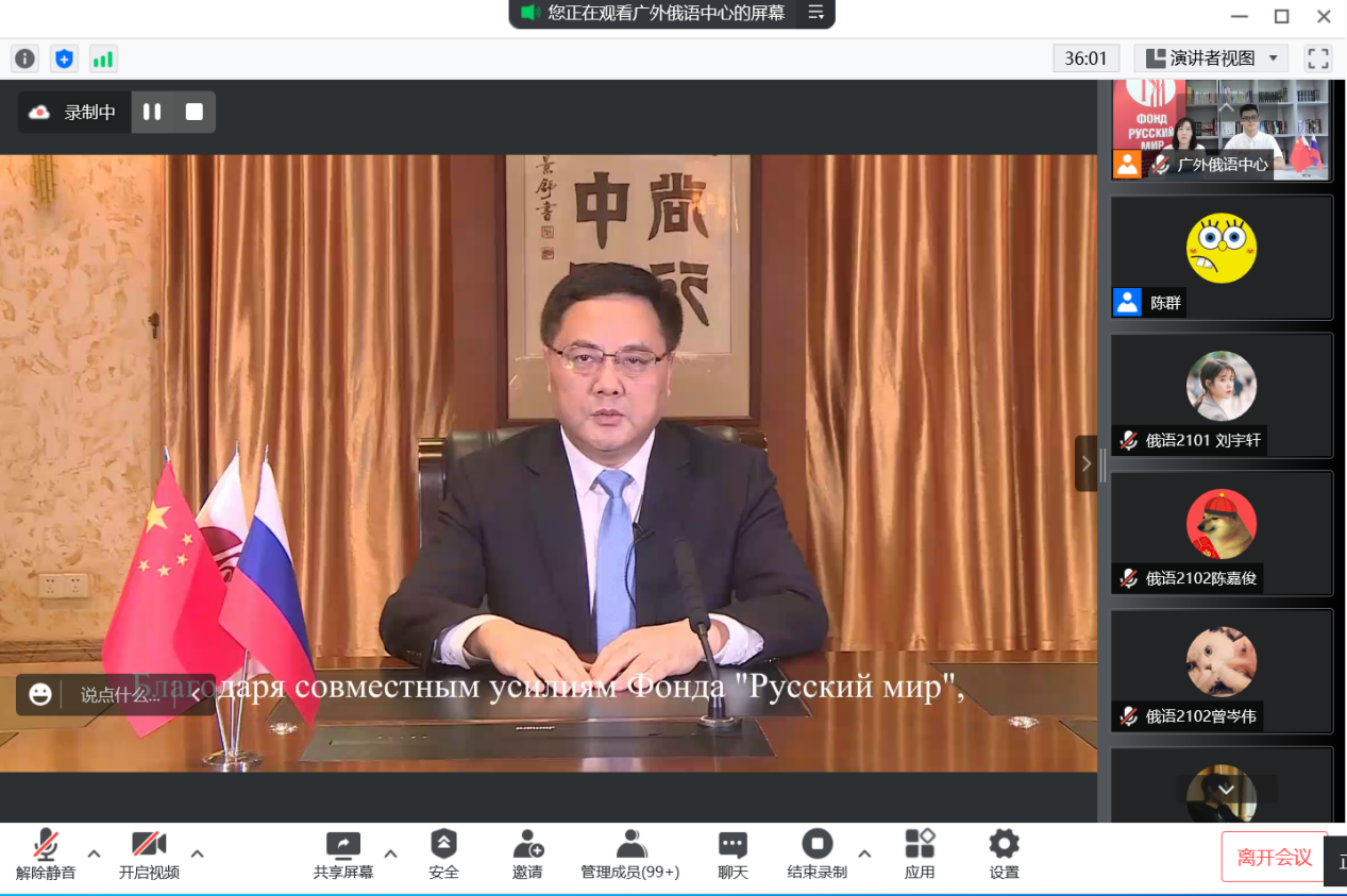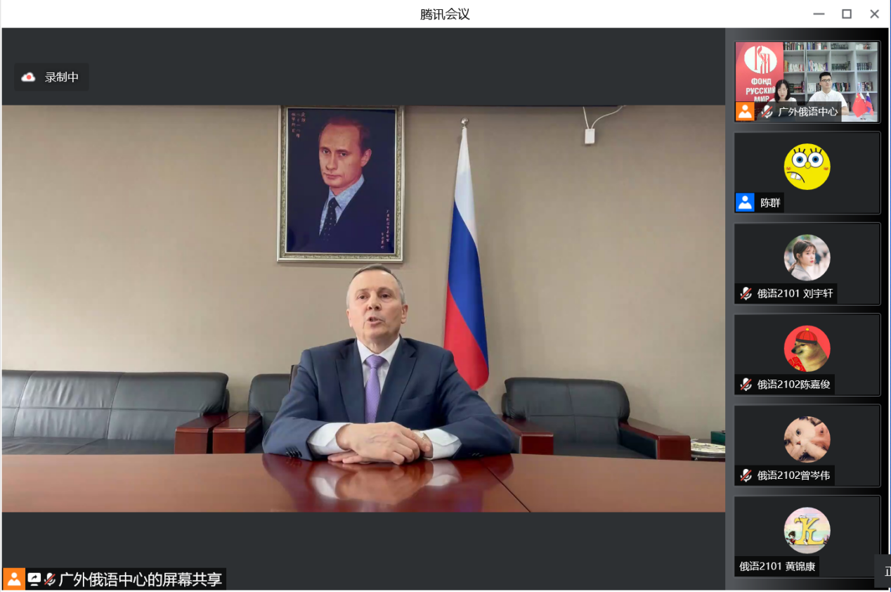 本网讯 5月28日,由广东外语外贸大学俄语中心和俄罗斯联邦驻广州总领事馆共同主办,我校西方语言文化学院和北京俄罗斯文化中心协办的第11届“俄语日”暨“中俄体育交流年续写两国友好新篇章”短视频大赛颁奖仪式线上举办。我校党委书记、校长石佑启,俄罗斯联邦驻广州总领事馆总领事亚历山大·切尔诺乌索夫,北京俄罗斯文化中心主任塔玛拉·卡西亚诺娃分别为本届“俄语日”活动致辞。