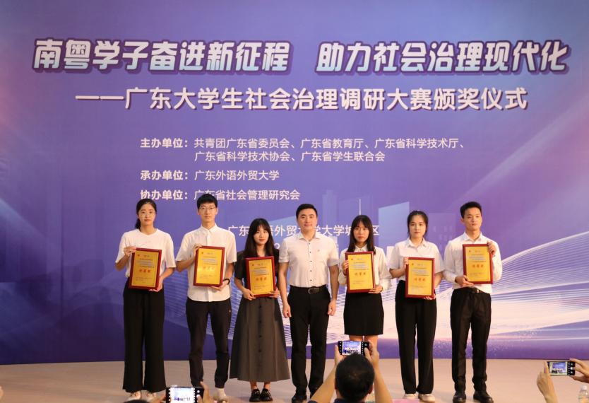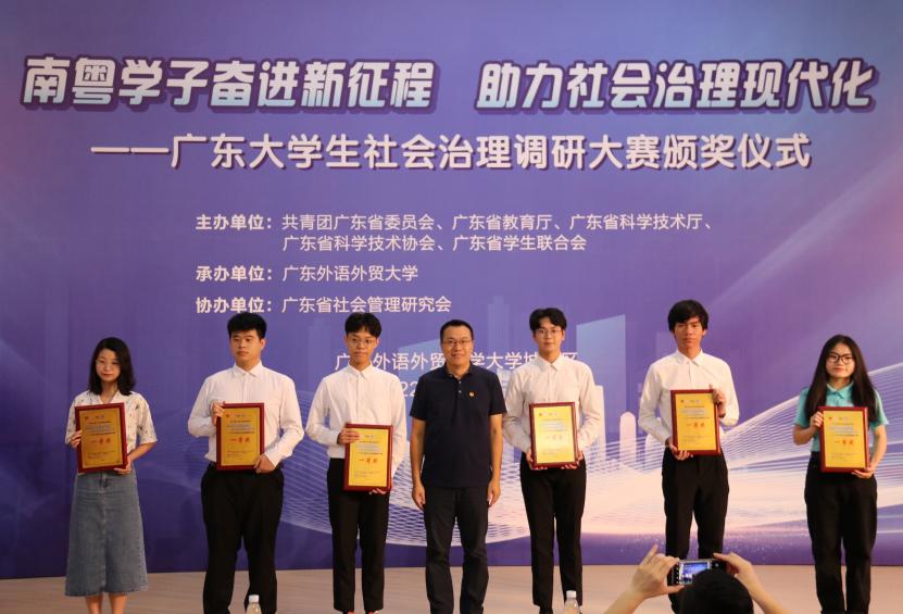 本网讯 7月3日,广东大学生社会治理调研大赛决赛颁奖仪式在南校区举行。此次大赛由共青团广东省委员会、广东省教育厅、广东省科学技术厅、广东省科学技术协会与广东省学生联合会主办,广东外语外贸大学承办,广东省社会管理研究会协办。我校获特等奖7项,一等奖4项,二等奖3项,三等奖1项。