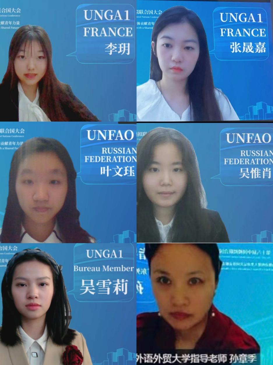 在广外模联协会指导老师孙章季的指导下,张晟嘉和李玥代表法国参加了“裁军和发展之间的关系”议题(联合国大会第一委员会),叶文珏和法学院学生吴惟肖代表俄罗斯参加了“确保新冠大流行期间的粮食安全及营养”议题(联合国粮食及农业组织)。高级翻译学院学生吴雪莉以会场主席身份参与。广外代表团队员们在会场上分别就相关议题进行深刻探讨和有效磋商,大力推进会议进程,积极撰写决议草案,展现出卓越的风采,受到评委们的一致肯定和高度赞扬。