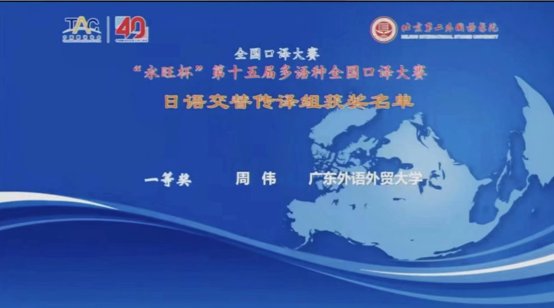 本网讯 11月5日,由中国翻译协会、北京第二外国语学院共同主办的“永旺杯”第十五届多语种全国口译大赛在北京举行。我校日语语言文化学院学生周伟获日语交传组一等奖、俞莹获日语同传组优秀奖,西方语言文化学院学生贺欣瑶获法语交传组二等奖,东方语言文化学院学生张琳娜获韩语交传组优秀奖。