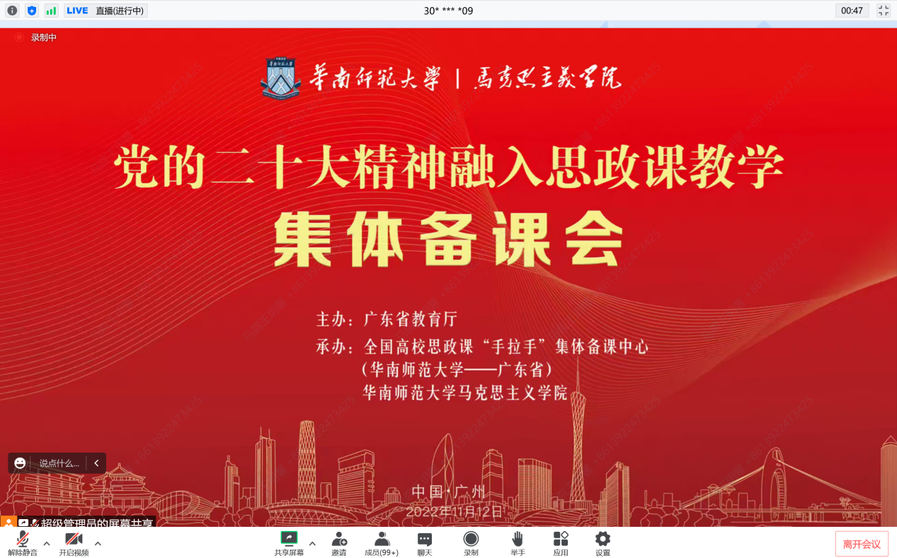 本网讯 11月12日,马克思主义学院组织学院教师通过线上平台参加由广东省教育厅主办,全国高校思政课“手拉手”集体备课中心承办的“党的二十大精神融入思政课教学”集体备课会,旨在学习贯彻党的二十大精神,提升思想政治理论课教师队伍的教学水平和专业素养,推动党的理论创新最新成果进教材进课堂进头脑。