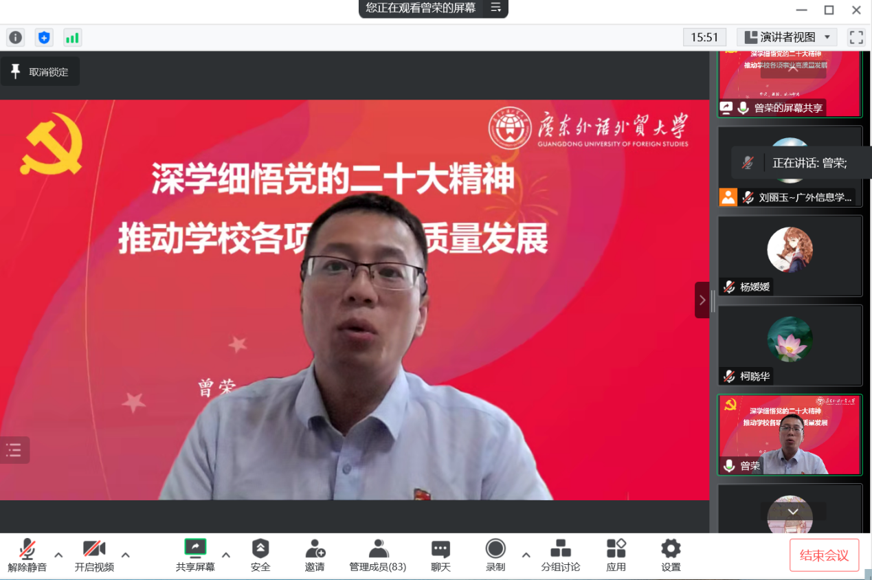 本次学习会由信息学院党委书记柯晓华主持。柯晓华指出,一代人有一代人的担当和使命,信息学院将继续发挥理工科特色和优势,与学校主流学科共同进步,助力新文科建设,构建以立德树人为中心,以人才培养、教学科研、学科建设、社会服务、国际交流合作、中华文化传承与创新为载体的发展目标和格局。每一位党员同志和师生员工要把党的二十大精神学深悟透、落到实处。