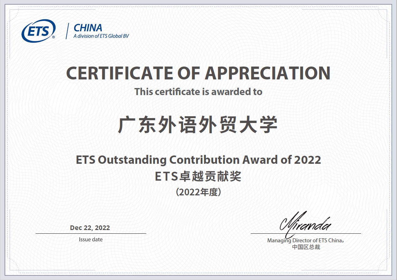 据悉,我校于2019年3月获ETS中国区王梦妍总裁专程授予感谢信,这是ETS进驻中国大陆38年以来首次以官方名义、书面形式对国内首家、唯一考点致谢。我校还先后获颁教育部教育考试院和美国教育考试服务中心联合授予的“2018年度全国托福优秀考点”、“2020年度全国托福考点贡献奖”等荣誉称号。