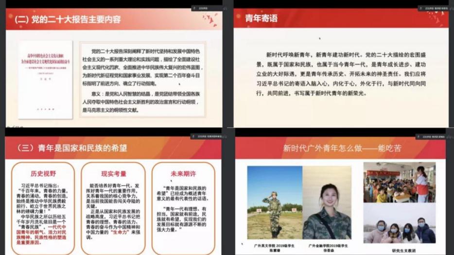 汲取思想伟力,凝聚奋进力量。宣讲团成员陈宇、贾怀愉、王俐程、李俊晓以“用党的二十大精神指引广外学子做德法兼修的新时代好青年”为主题,以知情意行为主线,结合党的二十大报告中的重点论述和广外学子的真实故事,指引广大学生如何成为德法兼修、奋发有为的新时代青年。