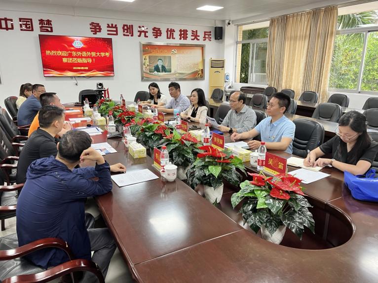 信息学院代表与东华高级中学进行座谈,2017年底我校已与该校共建优质生源基地,历年多名考生被广外录取。东华高级中学副校长冯杨表示后续会推进两校合作。