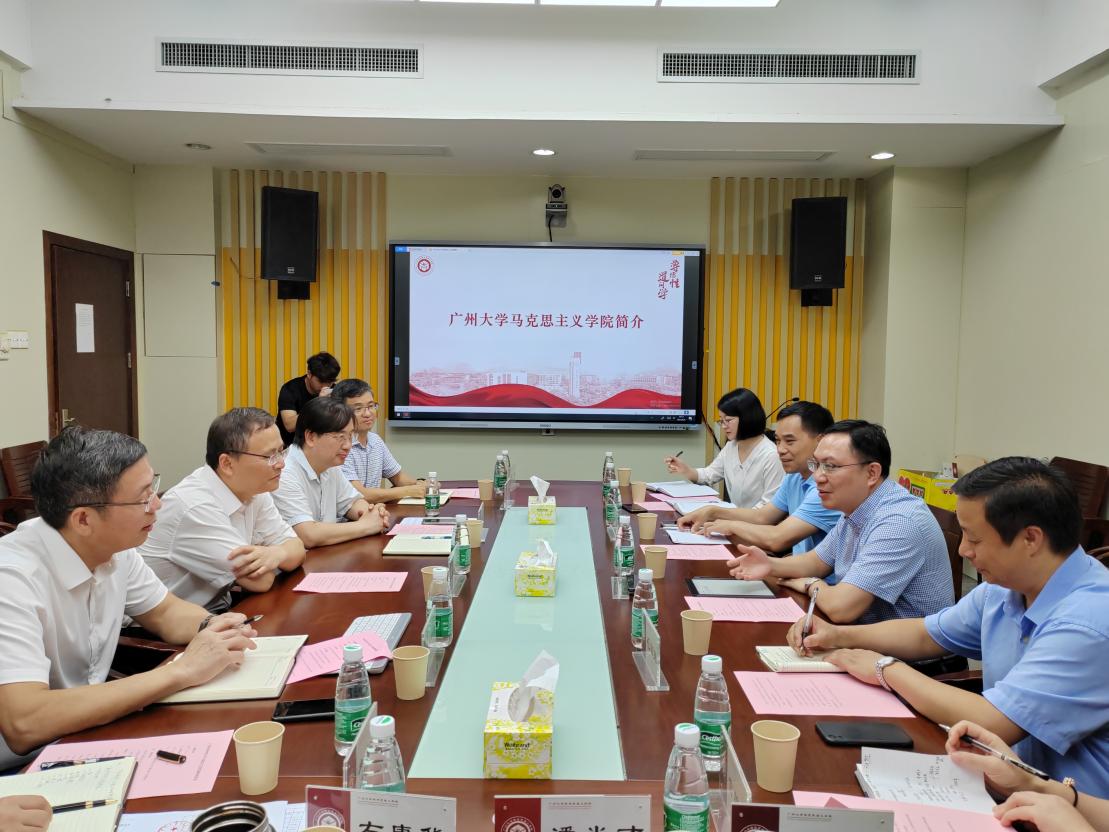 调研会上,吴开俊聚焦“整合学科优势力量”分享了学位点申报的宝贵经验。赵中源介绍了广州大学马克思主义学院的历 史沿革、学科建设、教学科研、人才培养等情况。罗明星介绍了学院科研团队建设以及领导班子科研奖惩机制的实施情况。广州大学马克思主义学院还就研究生培养工作、社会实践课程建设、习近平新时代中国特色社会主义思想概论课程建设等问题进行了经验分享。