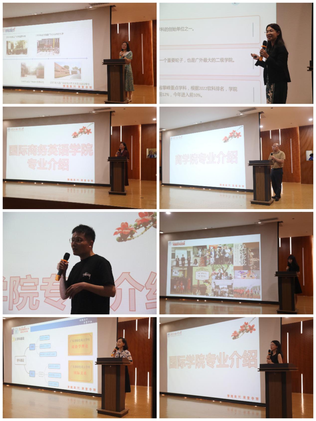 活动由国关学院党委书记袁薇佳主持。英语学院、经贸学院、商英学院、商学院、金融学院、西语学院、国关学院、国际学院教师代表分别围绕学院专业情况、学院特色、新增专业、就业情况等内容作专题宣讲。