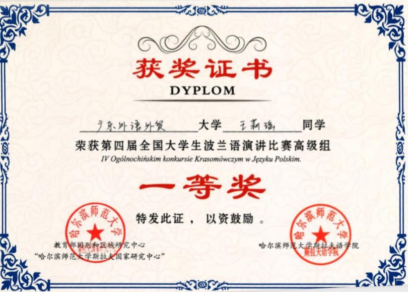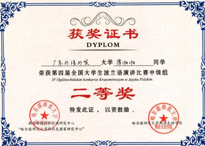 本网讯 10月13日至15日,第二届国内高校波兰语学科发展论坛暨第四届全国大学生波兰语演讲比赛在哈尔滨师范大学举行。我校西语学院波兰语系本科生王莉瑶获高级组一等奖,谭湘湘荣获中级组二等奖,梁嘉煊荣获三等奖。