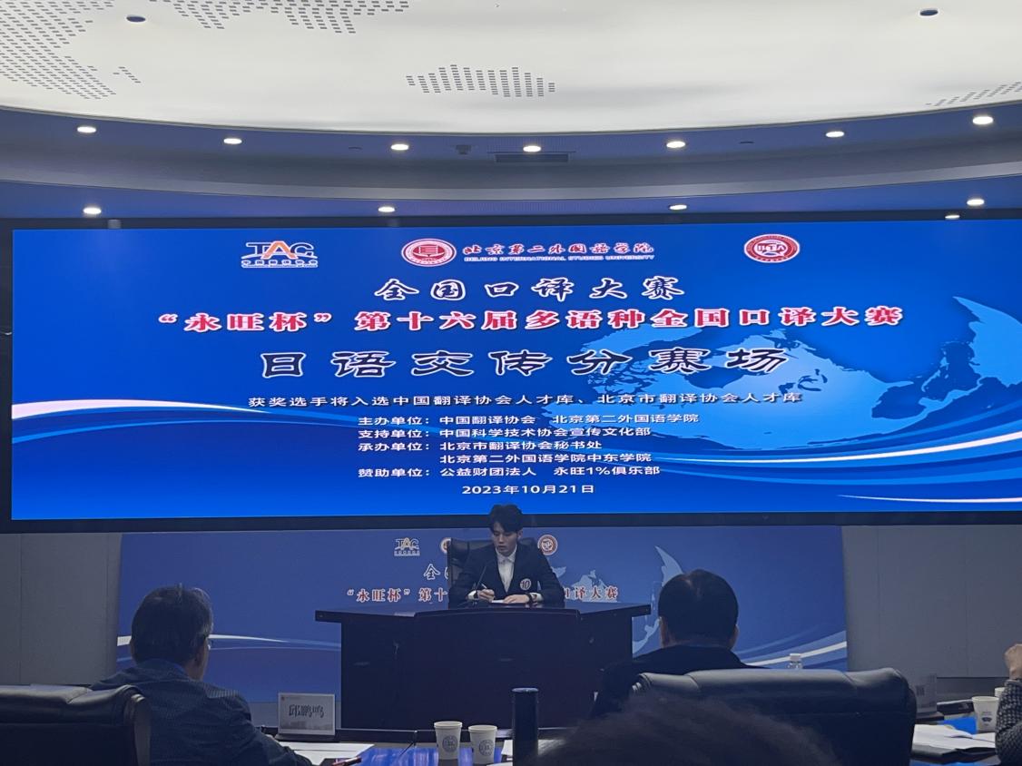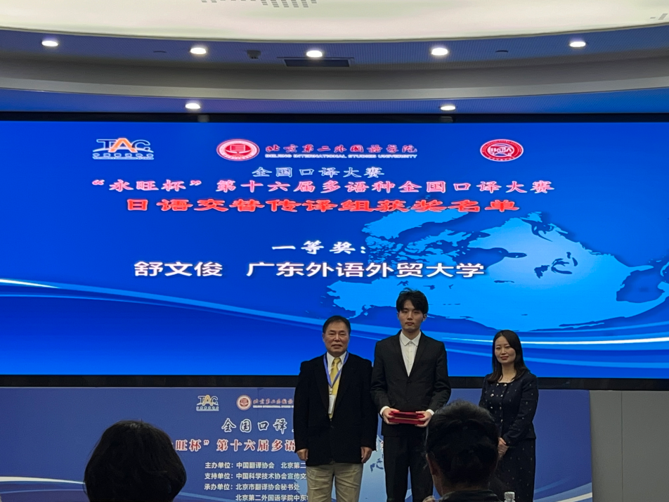本网讯 10月21日,由中国翻译协会与北京第二外国语学院共同主办的“永旺杯”第十六届多语种全国口译大赛于北京举行。此次比赛中,我校2022级日语翻译硕士生舒文俊同学荣获日语交替传译组一等奖,黎敏君同学获得日语同声传译组优秀奖。