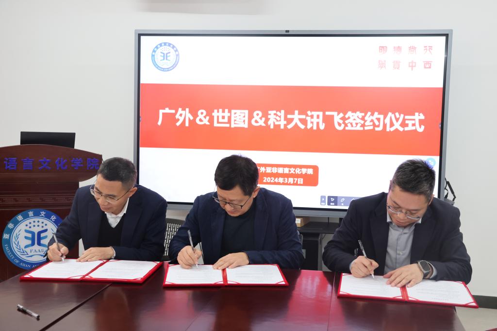本网讯 为推动非通用语教学资源与AI技术的深度融合,创造市场领先的产品和服务,促进外语非通用语学科建设与发展,我校与世界图书出版社广东有限公司(以下简称世图)、科大讯飞股份有限公司(以下简称科大讯飞)签约仪式于3月7日上午在我校亚非学院会议室举行。亚非学院院长全永根、世图广东公司总经理卢家彬、科大讯飞高教产品线华南区经理李征华签署框架协议,开启2024年度深入合作新篇章。