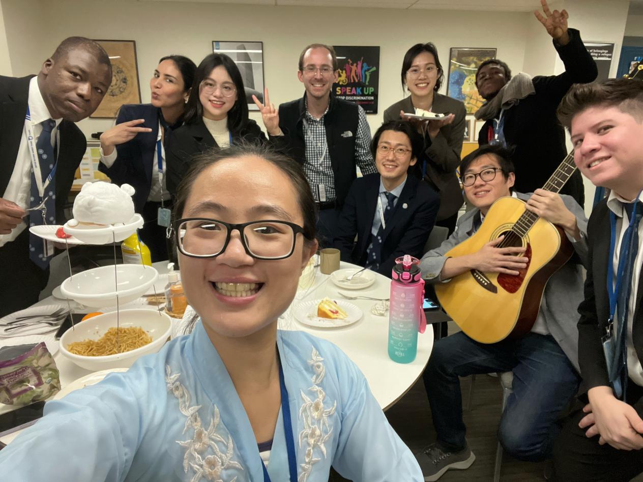 “联合国的工作氛围真的非常好。”巧妙的是,联合国日和曹咏仪的生日正好是同一天。去年的10月24日,既是联合国78岁的生日,也是曹咏仪22岁的生日。当天,全球传播部的同事们不仅为她准备了蛋糕,还精心用吉他弹奏了生日歌,传递不同文化之间的祝福。在实习期间,曹咏仪与身边不同国家的同事也有着文化碰撞的新鲜体验。来自奥地利的同事Herta和韩国的同事Soomin在学习中文,经常会向她请教各种词汇的含义,曹咏仪在耐心回复的同时,还会将蕴含广府文化的粤语也教授给同事们。春节期间,曹咏仪将带有“招财进宝”合体字和“福”字的红色灯笼送给身边的同事,并解释着对应的文化寓意,同事们对此非常开心,有的甚至还会多要一只红灯笼,希望将这份文化喜庆带回家中。“满满的成就感”是曹咏仪最直接的感受。曹咏仪还会在送出的新年贺卡上写上英文的新春祝福,并向同事们解释“恭贺新禧”“金龙呈祥”等词的含义。