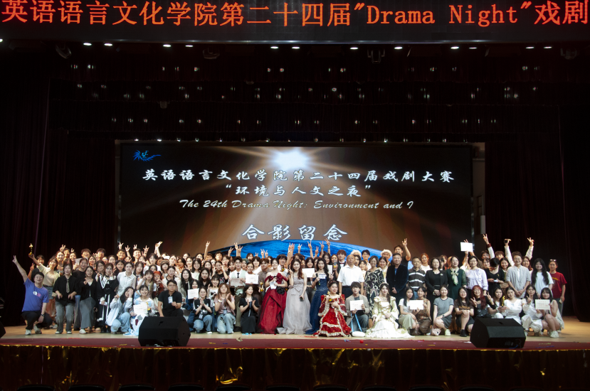 本网讯 5月23日晚,英语语言文化学院第24届“Drama Night”英语戏剧大赛“环境与人文之夜”在白云山校区云山会堂落幕。两个半小时的演出扣人心弦、精彩纷呈,《马戏团之夜》《希阿娜》《弗缇利斯》《人鼠之间》剧目引人入胜。各组以“环境与人文”为主题,通过深度的思考、大胆的创想、生动的表演、团队完美的配合,将主题融入剧情之中,立足自然、自我、社会等角度,将不同环境对人的塑造和影响演绎得淋漓尽致,带领观众开启一场“环境与我”的探索之旅。