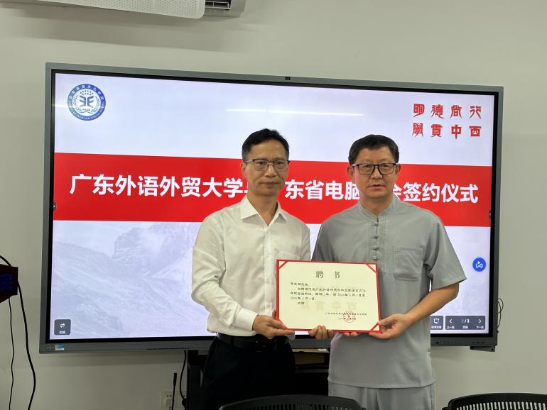 亚非学院院长全永根和马本湘分别介绍了广外和商会的情况,就未来合作方向展开讨论并签约合作协议。双方将共同推动“一带一路”国家倡议,为出海“一带一路”沿线国家的广东企业提供语言和咨询等社会服务,合作开展人才培养及建立海内外实习实践基地,积极探索校企联合培养创新型、实用型人才的新模式,搭建适应企业发展需求的人才输送渠道,实现资源共享,实现企业与高校在小语种人才培养模式选择、教学方法改革、提高学生实践能力等方面更广泛的合作。协议签署仪式后,全永根向马本湘颁发学院客座教授聘书,梁洁向熊昊、陈玖罗、剑芳颁发学院校外实践导师聘书。