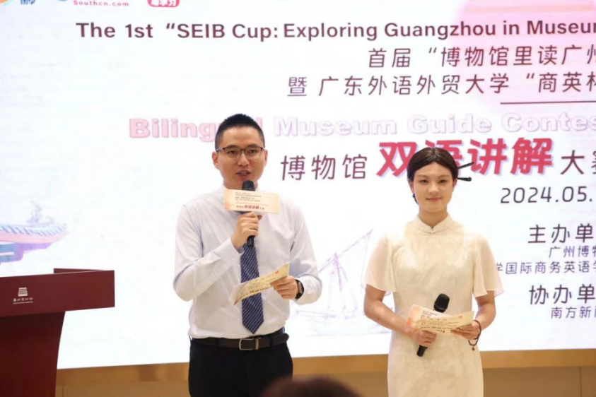 本网讯 近日,广东外语外贸大学国际商务英语学院携手广州博物馆举办首届“博物馆里读广州”暨广外“商英杯”博物馆双语讲解大赛。本次大赛以“海上丝绸之路”为主题,为学生讲好中国故事提供实践和展示的平台,决赛在广州博物馆镇海楼举行。本次大赛在广博视频号、广外青年视频号、南方网等多平台同步直播,在线观看人数达9.3万人次。