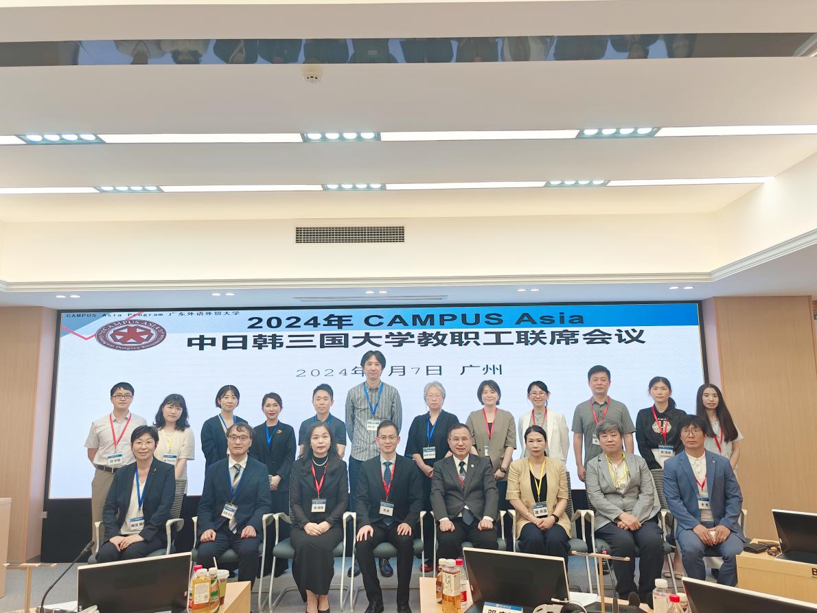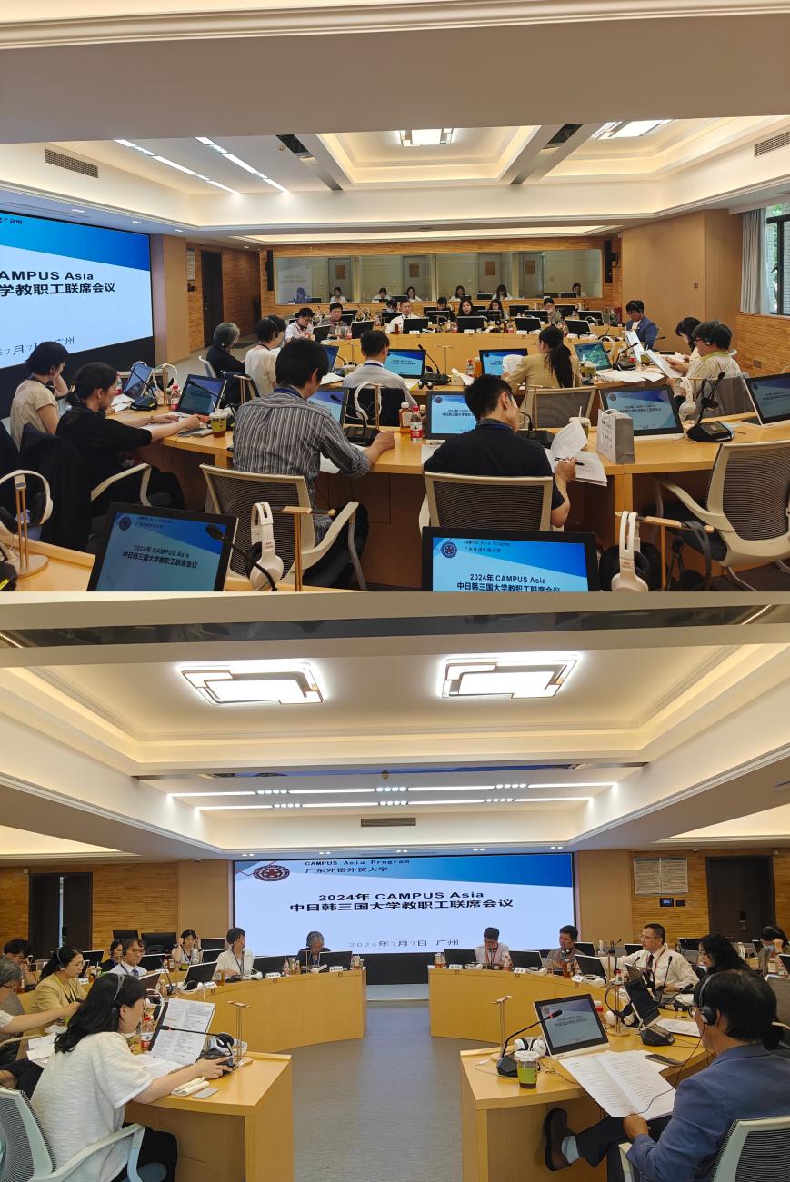 本网讯 近日,2024年亚洲校园中日韩三国大学教职工联席会议在我校白云山校区六教A301同声传译会场召开。我校国际交流合作部部长周鹏、日语语言文化学院名誉院长与中方“亚洲校园”计划创始人陈多友、日语语言文化学院院长杨晓辉、副院长程亮,以及中日韩三方大学(广东外语外贸大学、日本立命馆大学、韩国东西大学)的相关教职员工共同出席了本次会议。会议由我校亚洲校园教育中心主任邓宇阳主持。