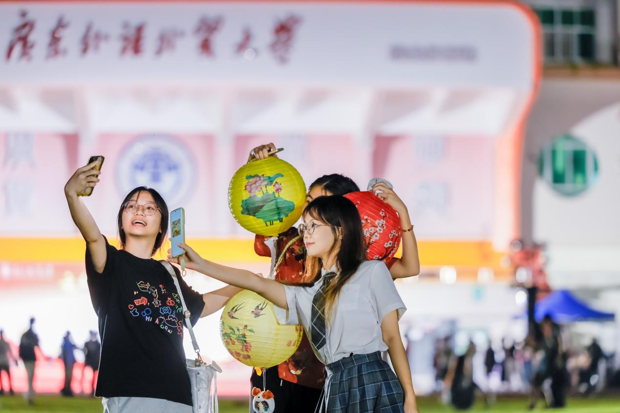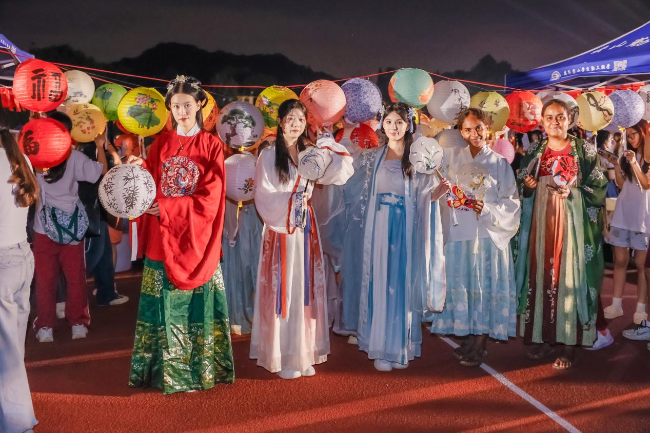 本网讯 提着灯笼,把着团扇,画着糖画,戴着脸谱,持着毛笔,猜着灯谜,剪着纸花,点茶打膏,对弈作诗.....一位位穿着汉服唐装宋袍的学生仿佛漫步在古代的街市上,一侧的角落穿着维吾尔族衣服的女生正在与穿着汉服的留学生共舞,一幅“美美与共”的画卷正在广外学生社区铺开。