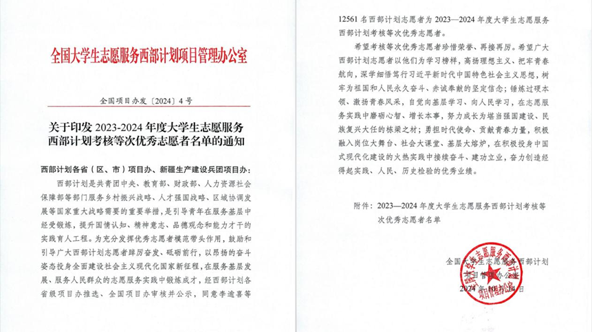 本网讯 近日,西部计划全国项目办印发了《关于印发2023-2024年度大学生志愿服务西部计划考核等次优秀志愿者名单的通知》,经西部计划各省级项目办推选、全国项目办审核并公示,我校共有8名志愿者获评全国西部计划考核优秀等次志愿者,分别是:经济贸易学院李枚忆、商学院成梦嫣、西方语言文化学院祝婉婷、亚非语言文化学院朱毅晖、法学院叶洁双、国际关系学院黄奕涵、社会与公共管理学院孙丽媛以及信息科学与技术学院高海丽。