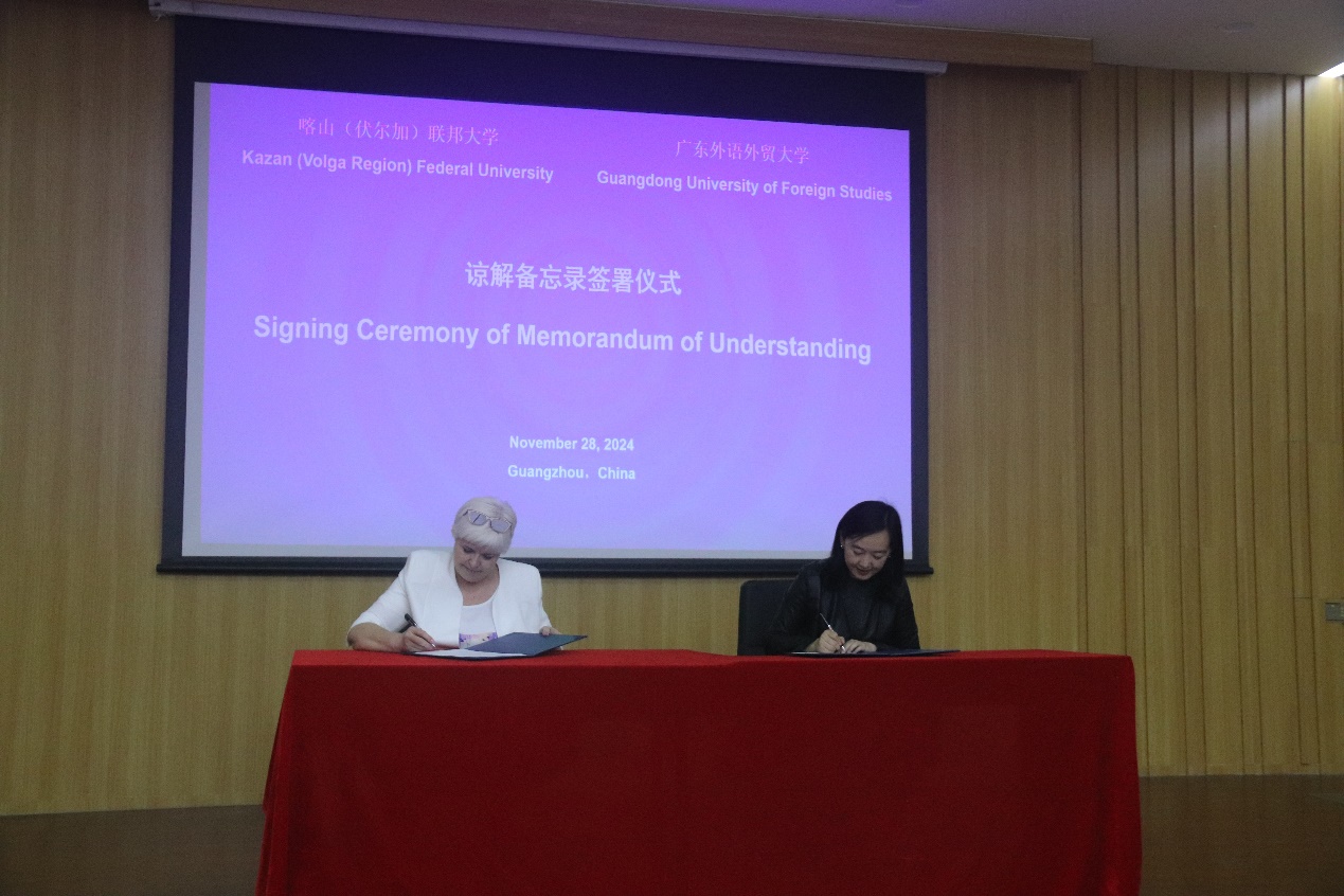 吴艳和塔赫塔罗娃·斯维特兰娜分别作为两校代表签署了《广东外语外贸大学与喀山联邦大学谅解备忘录》。