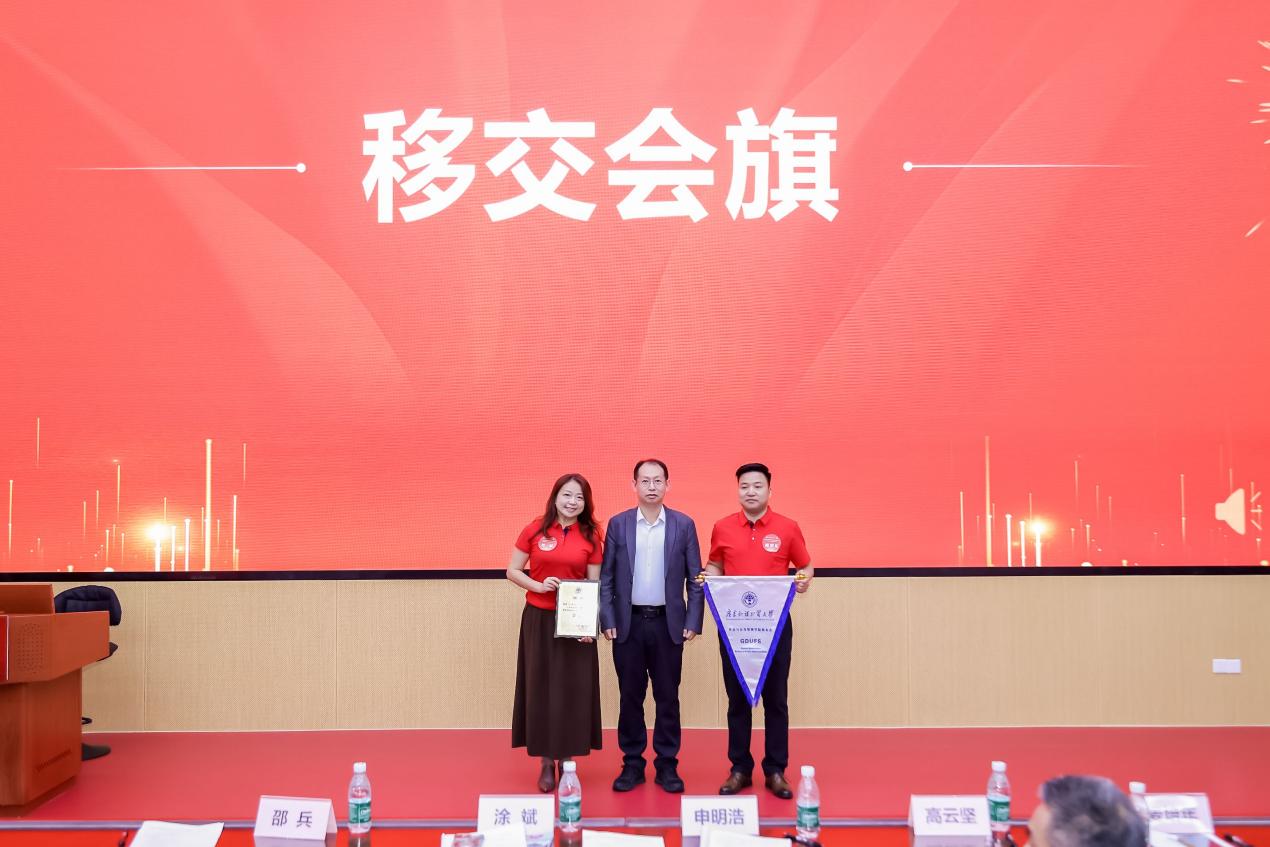 申明浩向公管学院第二届校友理事会会长涂斌颁发聘书,并向执行会长廖奕东移交会旗。