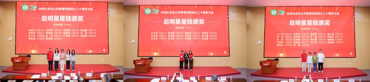 据悉,自2006年以来,公共管理学院面向全院本科生实行“启明星制度”,发挥高年级学生的先发优势,指导低年级学生的成长。经过早期的摸索,现已逐渐制度化,先后有近4000多名同学受益于该制度,学院形成学生互帮互助的“家文化”,成为学院学生服务的有效手段,得到学生的认可。原学院党委书记高云坚,原学院党委副书记、马克思主义学院党委书记麦培年、原学院辅导员梁玲华老师分别上台为最长启明星星链颁奖。各届星星家族成员齐聚一堂,温情回忆,共话今朝。