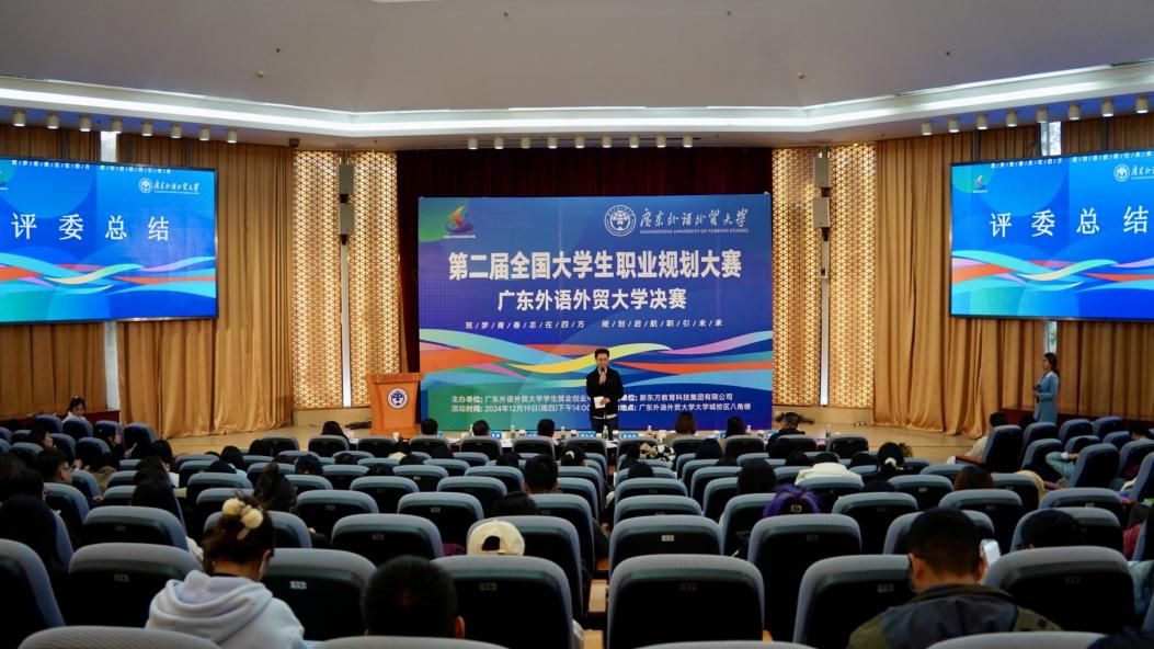 本网讯 12月19日下午,第二届全国大学生职业规划大赛广东外语外贸大学决赛于大学城校区八角楼会议室举行,16名决赛选手一展风采。学生就业创业中心和相关学院的负责人、指导老师出席本次比赛,共300多名学生现场观摩。
