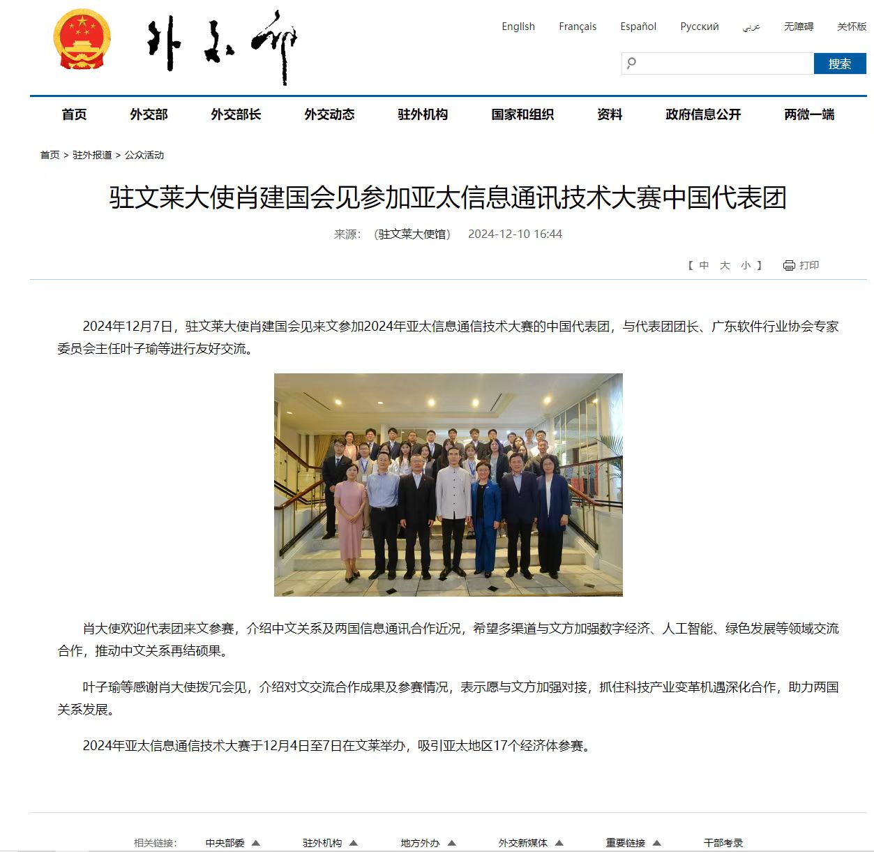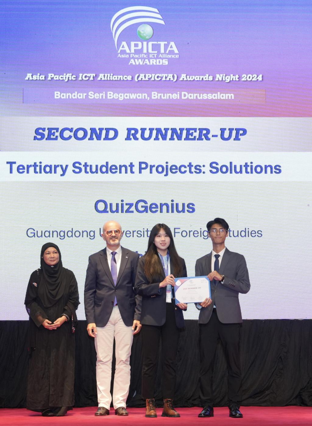 本网讯 2024年亚太信息通讯科技大赛(APICTA)于12月2日至8日在文莱举办,信息学院学子与商学院学子组成的“QuizGenius”项目团队表现出色,在专上学生项目(方案组)中荣获季军。此外,中国驻文莱大使肖建国专程会见了中国代表团,信息学院教授丘心颖受邀担任本届大赛的评委,和参赛学生梁金如、林耀东等一同参加了会见,外交部网站对此进行了报道。