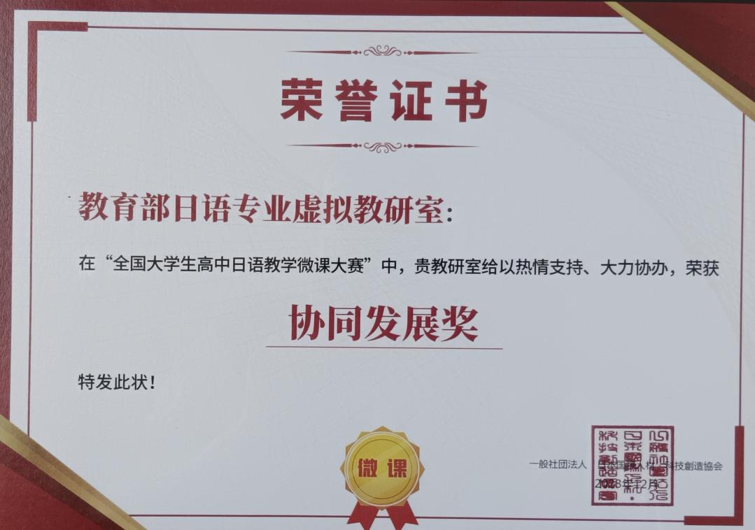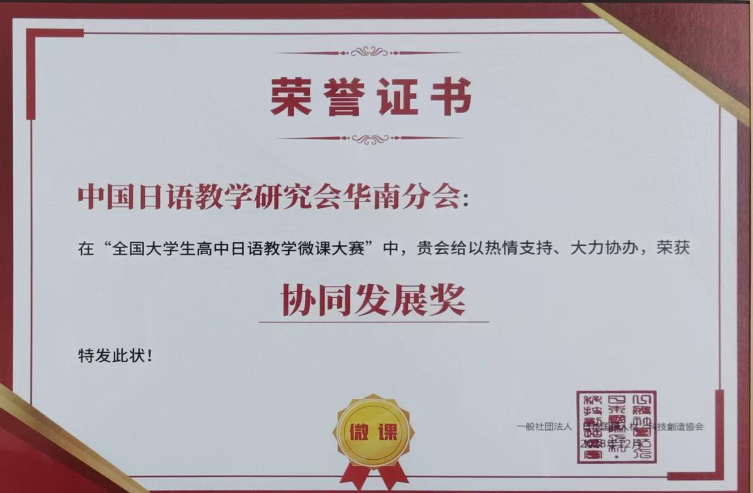 本网讯 近日,日语学院在日语教育领域再添殊荣,凭借在“全国大学生高中日语教学微课大赛”中的贡献,荣获日本国际人才・科技创造协会颁发的“协同发展奖”。