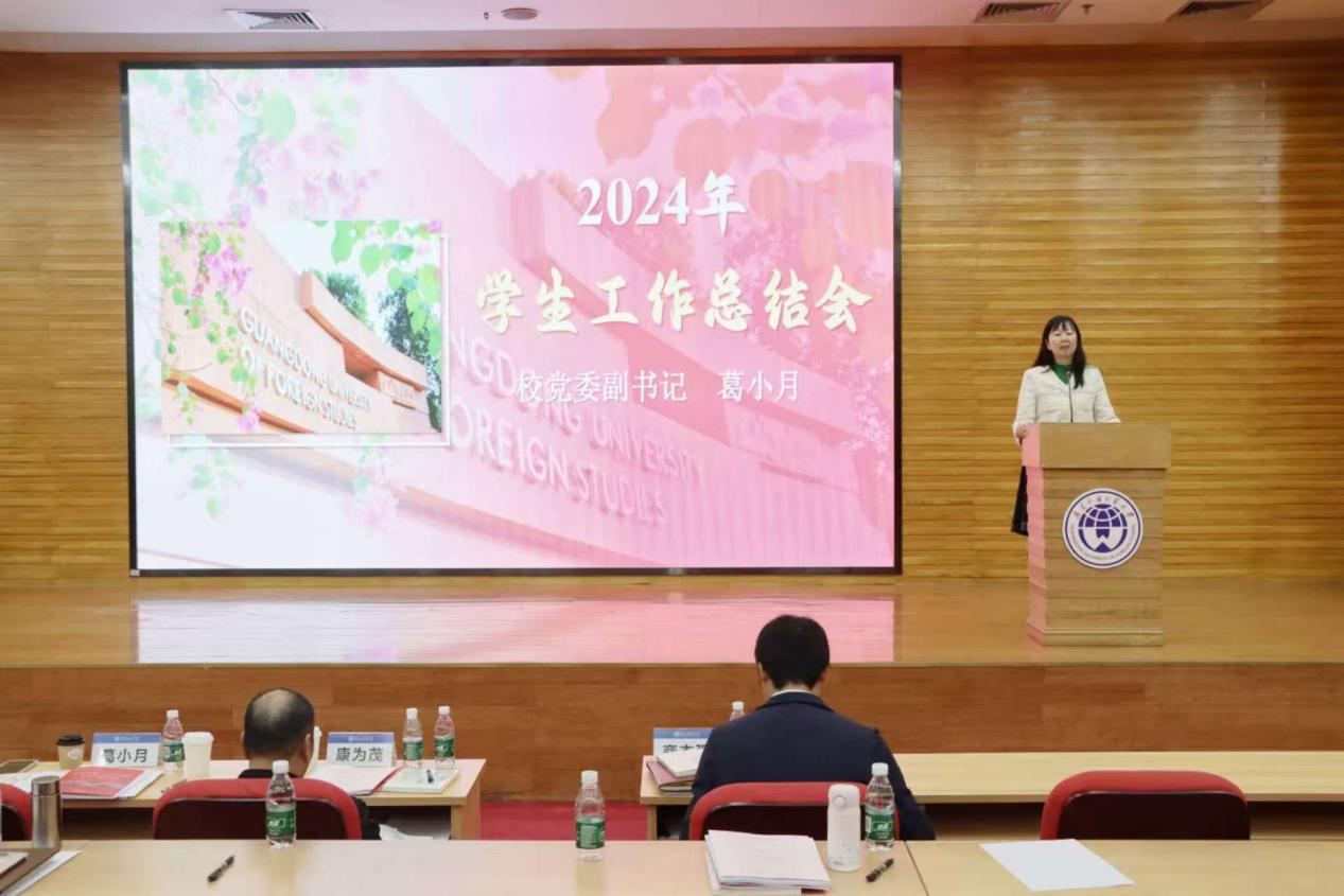 校团委书记刘郎、学生就业创业中心主任康为茂和学生工作部五级职员商杰强分别总结了2024年度工作情况,并就下一年的学生工作做具体布置。刘郎从思想、科创、实践、文化、组织五个部分全面回顾了广外共青团的2024,并强调2025年将继续聚焦政治引领、强基赋能、全面发展、润心育人这五个关键领域,以推动全校共青团工作的高质量发展。康为茂指出2024届毕业生就业率连续三年保持高位。接下来,学生就业创业中心将继续汇聚多方合力、做实做细毕业生就业服务,稳步推进2025届毕业生的就业创业工作。商杰强以“干字当头实干细干 五育并举育人育才”为主题对学生工作部2024年的工作进行了总结,并强调在接下来的一年中,应在学工队伍建设、学生社区发展、学风校风建设、学生安全保障、心理健康教育、勤工助学支持以及信息平台建设等多个领域持续发力,以推动我校学生工作再上新台阶、再创新局面。