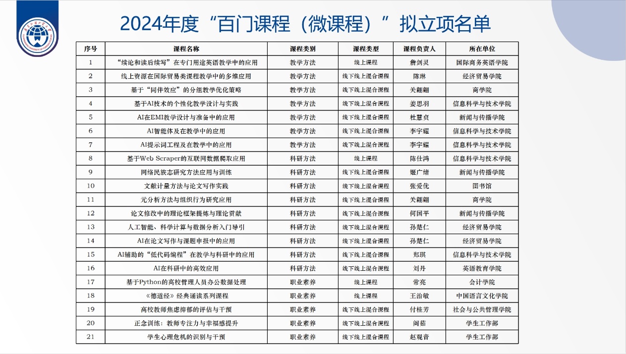 据悉,为进一步促进校内培训课程的质效提升,促进教师专业化发展,打造广外教师发展的共同体,中心启动了将于2025年开设的“百门课程”微课程的申报和评审工作。本轮课程建设工作增加了课程选题征集环节,将通过微课程的形式,一次课程聚焦一个专题问题的解决,通过线上课程,以及线下线上混合课程的形式,扩大课程的覆盖面。课程也将紧跟时代步伐,涵盖人工智能等众多领域,满足教师们最新的学习需求,最终拟立项21门微课程。