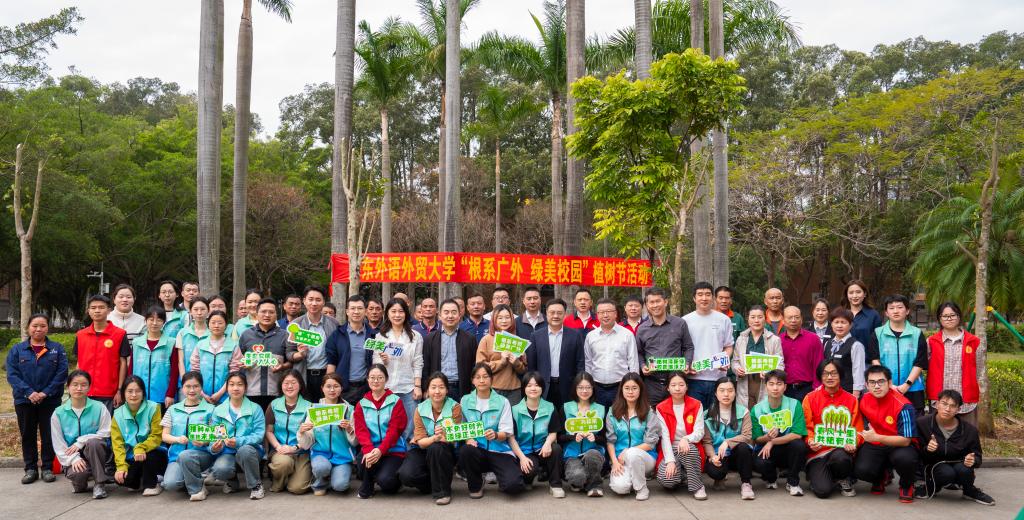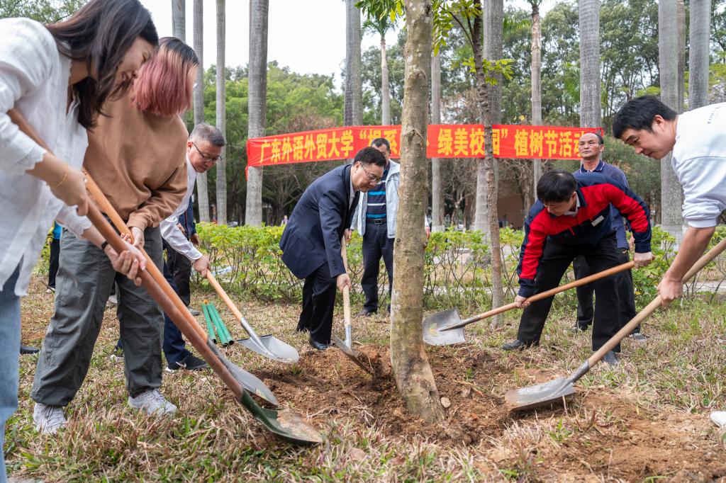 本网讯 春和景明万物苏,植绿添彩正当时。3月12日,第47个植树节当天,我校在大学城和白云山两校区同步开展植树活动。校党委书记石佑启、校党委副书记葛小月等校领导与师生代表共同种下100株新苗,以生态文明建设实践行动响应广东省“绿美广东”生态建设号召,打造具有广外特色的劳动育人场景。