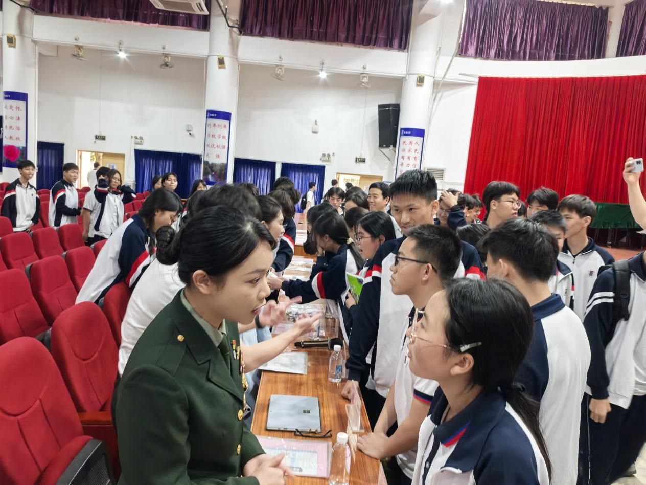 互动环节中,清新区三中学生踊跃向主讲人提问,主讲人耐心解答同学们疑惑,现场气氛热烈。“我觉得参军入伍最重要的是意志。我刚刚就看到你们顶着烈日开展国旗班训练,这种意志值得点赞,期待我们在部队里相见!”宣讲团成员胡叙妍给予该同学赞赏与肯定,并为他解读剖析了相关入伍政策。