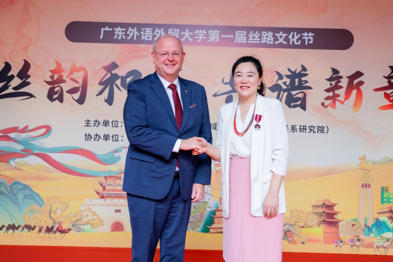 开幕式上,波兰共和国驻广州总领事彼得·诺沃特尼亚克先生代表波兰文化与民族遗产部,向区域国别学院(国际关系研究院)院长茅银辉教授授予象征波兰文化领域最高荣誉的“Gloria Artis”文化功勋奖章,表彰其在推动中波文化交流、增进两国人民相互理解方面做出的卓越贡献。茅银辉在致辞中表示,本次文化节旨在搭建一座文明互鉴的坚实桥梁,通过多元文化的交融碰撞,深化师生对“一带一路”沿线国家的了解。