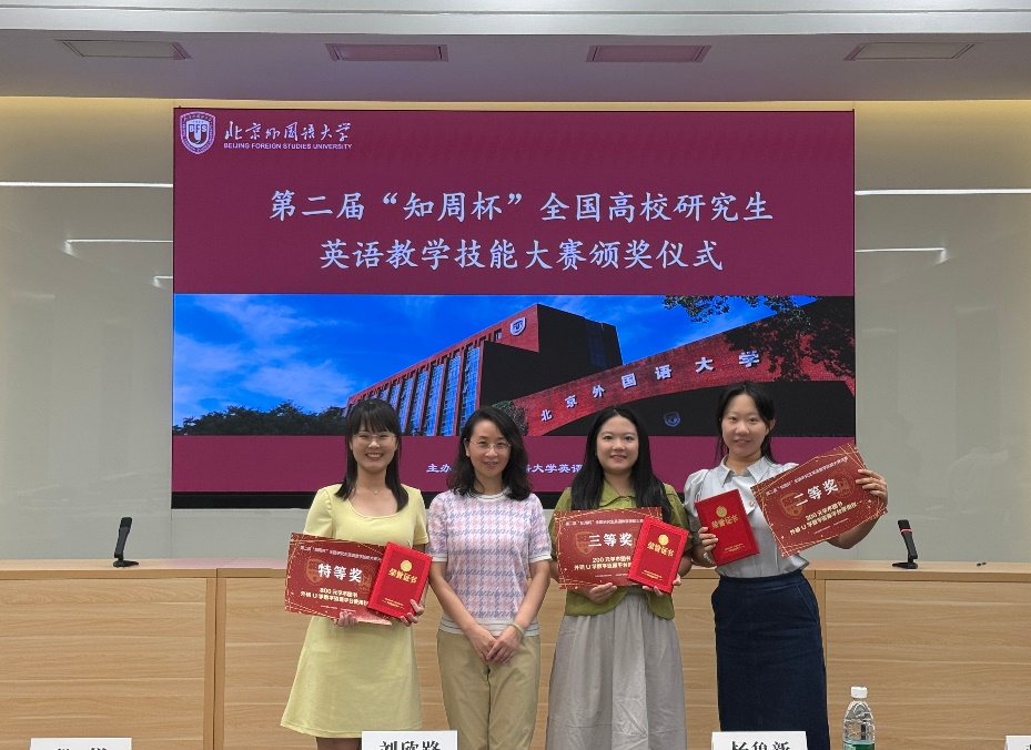 本网讯 6月15日,第二届“知周杯”全国高校研究生教学技能大赛决赛于北京外国语大学举行。在英语教育学院副院长李惠胤的指导下,英语教育专业2022级学子黎嘉茹荣获初中赛道特等奖,2023级学子许淡珊获得初中赛道三等奖;2023级学子董京京在高中赛道中斩获二等奖。