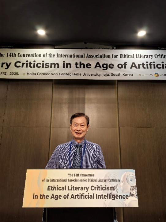 本网讯 2025年7月24至26日,由国际文学伦理学批评研究会联合韩国高丽大学人文社会数字融合人才培养事业团、韩国外国语大学文化与科技融合学院、韩国汉阳大学人文科学学院、韩国社团法人亚洲文化创意研究中心、浙江大学世界文学跨学科研究中心、广东外语外贸大学未来人文实验室、《外国文学研究》杂志编辑部共同主办的“人工智能时代的文学伦理学批评:第十四届国际文学伦理学批评研究会年会”在韩国济州召开。来自中国、韩国、英国、美国、日本、马来西亚、菲律宾、孟加拉国等国家的200余位专家学者出席活动。我校英国国家学术院外籍院士、欧洲科学院外籍院士、外国语言文学学科建设“云山工作室”首席专家、未来人文实验室首席专家聂珍钊及外国文学文化研究院副院长刘茂生等在内的专家及中青年学者参会。