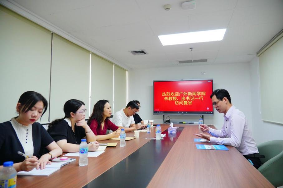 新闻学院师生交流团与东南亚多家主流媒体及华文媒体深入对话,探索国际传播新路径。泰国大众传播机构(MCOT)分享了从传统广播机构转型为综合型传播实体的历程,双方在国际传播案例共享、学生实习基地建设等方面达成共识。泰国公共电视台(ThaiPBS)介绍了传媒实践中的核心举措,双方就英语新闻服务、播客创新等议题明确合作方向。新加坡彭博新闻社作为全球领先的财经资讯机构,其亚太区总监倪承言介绍了AI在媒体内容翻译、算法训练等方面的应用,为广外“技术+传媒”跨学科培养提供了国际实践参考。