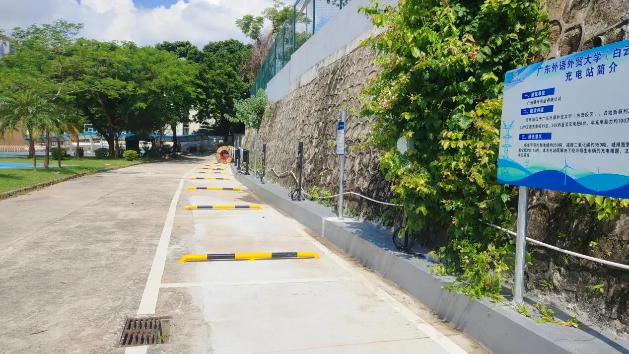 暑假期间,学校为两个校区的绿色出行添了份便利,白云山校区、大学城校区汽车充电站二期项目顺利完工,于9月5日正式投入使用。白云山校区的充电站选址财院体育馆后侧,新添6台30kW直流快充桩与7台7kW交流慢充桩,快充、慢充结合,满足不同车型的补能需求。