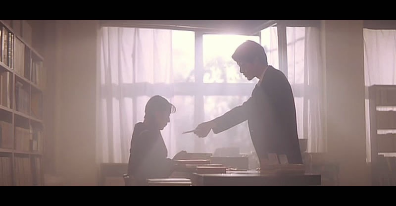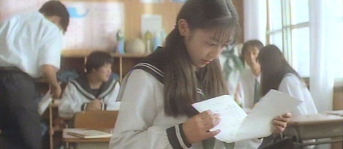《情书》是岩井俊二的小说改编作品,于1995年上映,饰演渡边博子和女藤井树的是中山美穗。导演在规划两人的镜头是对博子是稳定长镜头,服装偏向于纯色,以凸显她的安静。而树多是有运动感的镜头,服装上多图案,显示其活泼的性格。男孩在窗帘边看书的情景,片尾女生翻开借书卡看到画的场景,是日本影片的经典场面。