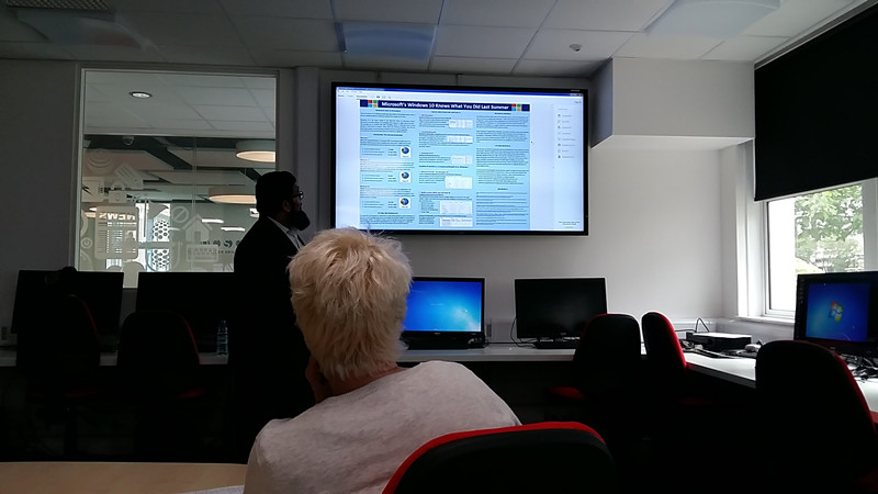 这位学生研究主题的是“Windows 10知道你上一个夏天做什么”,如图4所示。分析去年刚发布的Windows10,内部潜在一个部件SCRUM。该部件能悄悄地记录客户的各种按键行为,并且实时发回微软公司的网站,微软公司通过分析就可以知道客户在电脑的各种操作。听完学生的演示,让在座的各位老师,包括笔者惊出一身冷汗。为了这次访学,笔者特地买了一台新电脑,安装的正是Windows10。