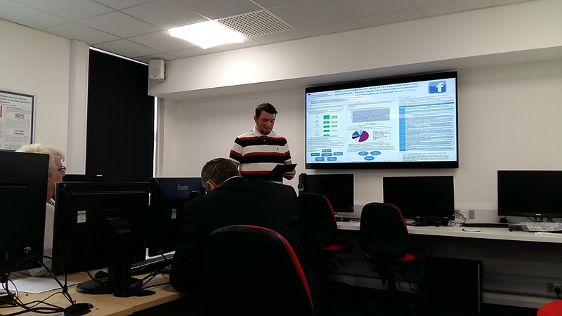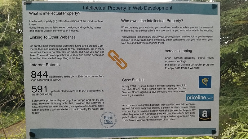 该大学计算机类专业课程设置中有一门课程叫做Professional Issues(专业问题),该课程教学内容包括与计算机专业领域相关的诸多问题。具体有:职业和专业精神,计算机滥用,法律和道德问题,知识产权,可持续性发展,专业的终身学习,个人和职业发展规划等。其中专门有1节介绍poster(海报),然后接下1周要求让每个学生选定一个主题,做一张海报,A4到A3左右大小,并且打印出来张贴在教室,供所有其他同学提问并打分。所有同学打分加老师的打分平均后,作为该课程最终成绩的重要组成。