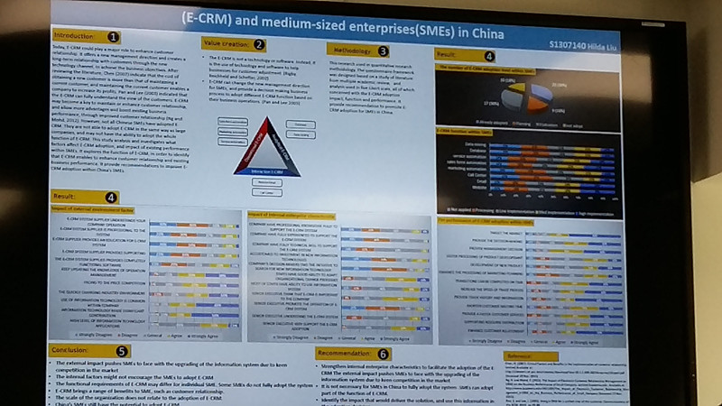 这位学生来自香港,主题是“中国中型企业的电子客户关系管理”。为了完成该论文,他向国内数百个企业发送邮件、通过调查问卷等方式,了解客户关系管理系统的应用情况。该海报分析现状、潜在问题、解决方向。小伙子海报做得有数据、有图形,做得实在好,以致于老师只是简单提了一个问题,就说没有什么需要问的了,perfect。如图3所示。