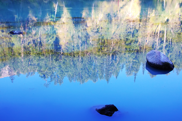 “倒影”——都说喀纳斯最美的是秋天,因为秋季昼夜的较大温差会使树叶呈现金黄、红色、绿色等不同的颜色,层次分明,煞是好看。我们去的时候是夏天,因为早起拍晨雾的缘故,发现朝阳照在湖边的树木上,竟然也是一片金黄。