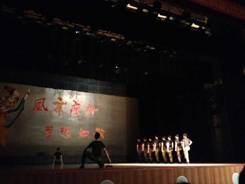 比赛前一晚,我们试穿了借来的服装。多数人觉得,绿色的连体军装很不好看,穿上去之后,就像一只只绿青蛙。最终,几位负责人决定,新购买演出服装。比赛那天上午,刘师姐、艺术团团长和另一位师姐兵分三路,出去挑选服装,最终选定黑色上衣、迷彩长裤。在下午进行的联排之前,我们的服装顺利到位。刘师姐等三人的辛苦是值得的。拿到衣服之后,我们分别到卫生间换衣服,大家都觉得男生穿上后很帅,女生穿上后很霸气。联排后,张师姐传达了在场几位老师的意见和建议:就整个节目来说,达到了迎新生演出的节目水平;但就动作来说,不够整齐。同时,我们也通过回看拍摄的联排视频,发现了除整齐外的其他问题,比如舞蹈鞋在舞台上容易滑、有些舞台灯光效果不好、部分队形位置偏了一点等等。