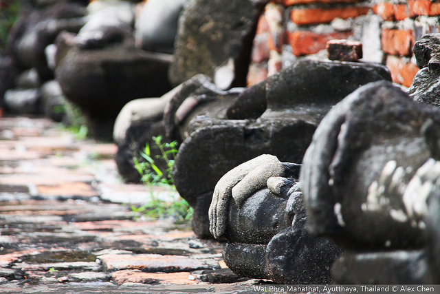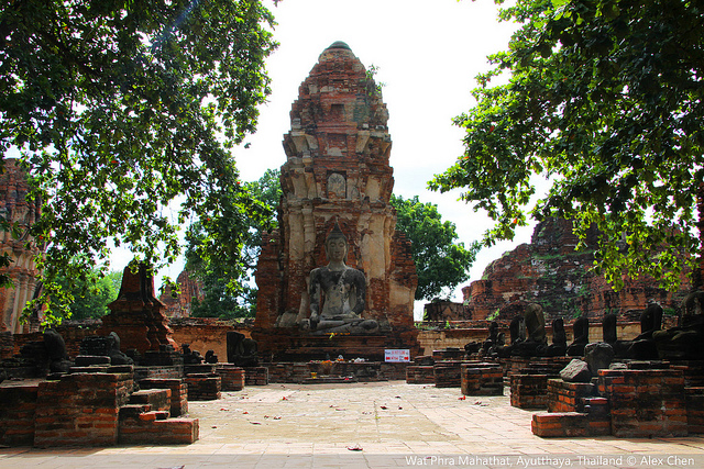 并排矗立的三座佛塔(stupas)之一 玛哈泰寺 玛哈泰寺在大城没落之后被森林所包围并侵蚀,其结果造就了该寺参观人数最多的佛像:佛像的头部被参绕在盘旋的树根中。在泰国佛教里面,这种圣像与大自然纠缠在一起的现象是极其幸运的兆头。