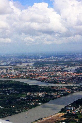 飞机上所见的湄公河 发动机轰鸣,风声灌耳,也依然能隐约地感觉到湄公河静静的流动。